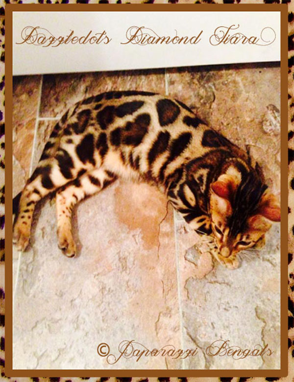 Tiara is Sired by GRC MARIEBENGAL ROCK STAR and Dam SUNSTORM CATCH MY FANCY and is a gorgeous girl with outstanding large brown rosettes outlined with jet black rings, her background color is a light contrast. Tiara has an exquisite profile with a strong chin, small rounded ears, big round golden eyes and straight nose. Tiara's coat is super silky and shiny with glitter throughout. Many thanks to Mara Summers of Dazzledots Bengals for entrusting us with this outstanding girl which will take us to a whole new level of Bengal breeding. Seeing is believing, there isn't enough words to describe this girl. Tiara is one of Dazzledots best produced kittens in the past 10 years. Her pedigree speaks for its self!